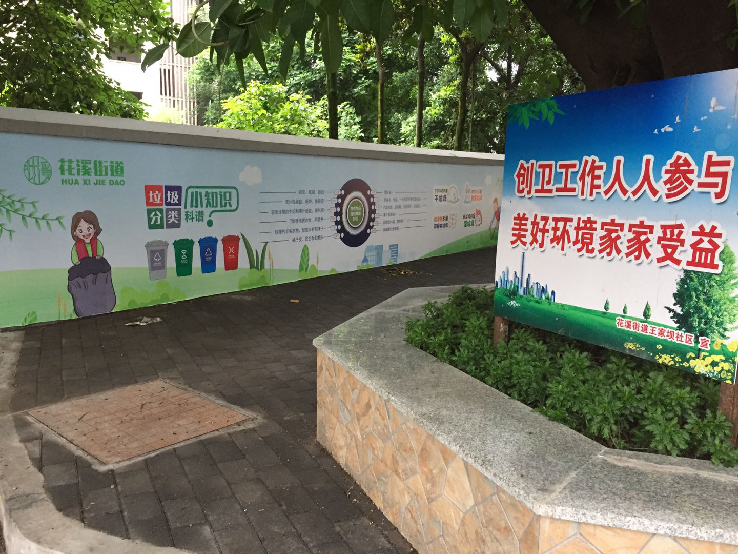 巴南区花溪典雅小学旁闲置块空地杂草丛生、废旧家具乱堆放、垃圾箱体脏污、道路破损等现象,严重影响校园周边面貌。花溪街道高度重视,党工委书记吴平、办事处主任叶奇、副主任彭志全、城管中心负责人吴宇多次到王家坝社区开展“马路办公”,经领导研究决定,将典雅小学旁环境卫生脏乱差的闲置地改造成家长在校门外接送学生停歇等候的休憩之地,同时打造垃圾分类宣传墙,让垃圾分类的知识走进校园,通过浸透教育方式激发孩子们垃圾分类意识。
