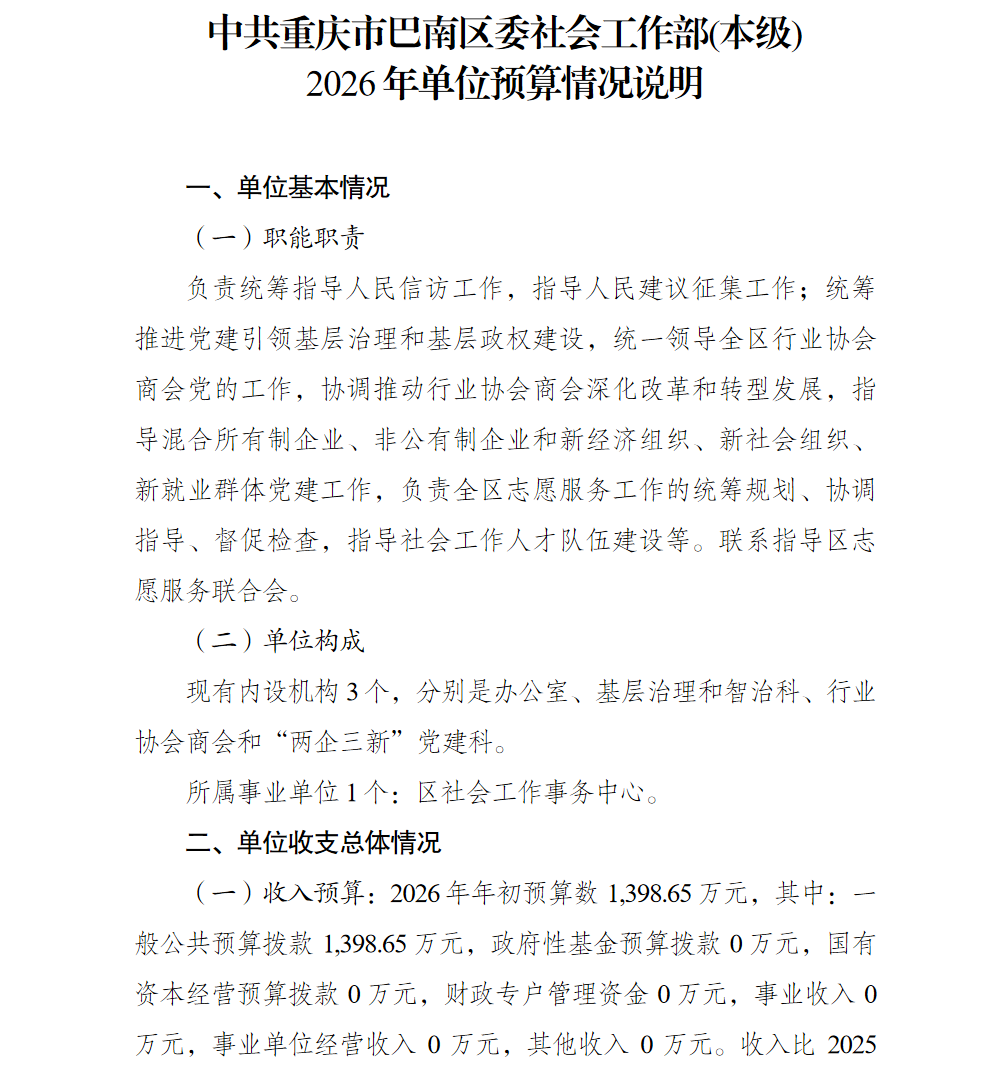 中共重庆市巴南区委社会工作部(本级)2026年单位预算情况说明及附表