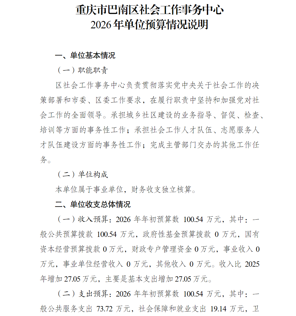 重庆市巴南区社会工作事务中心2026年单位预算情况说明及附表