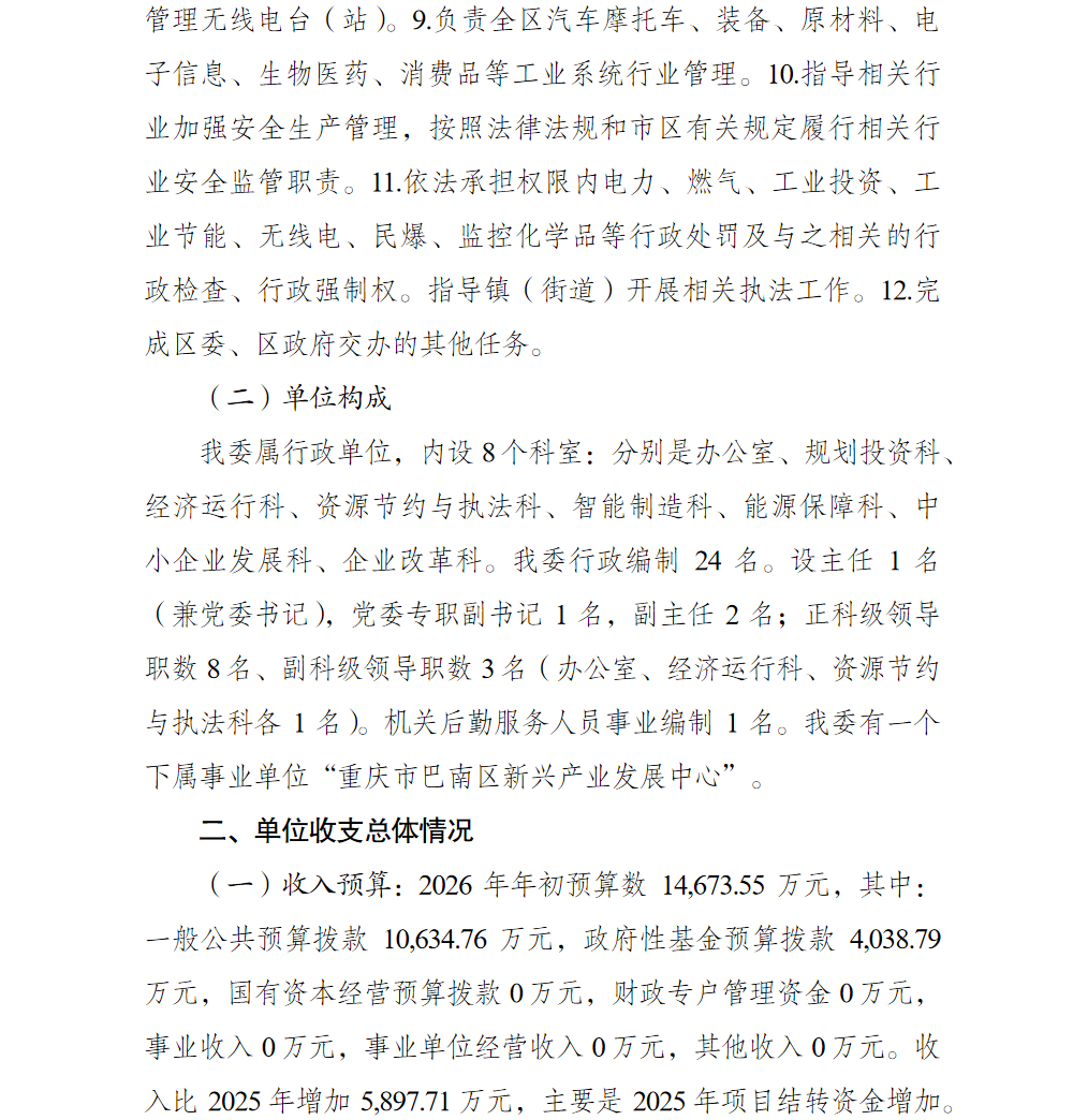 重庆市巴南区经济和信息化委员会(本级)2026年单位预算情况说明