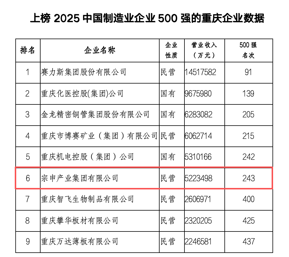 近日,中国企业联合会、中国企业家协会发布了2025中国制造业企业500强榜单,这是中国企联连续第21次向社会发布该项榜单。重庆共有9家企业成功入围,其中,巴南本土企业宗申产业集团有限公司强势登榜。