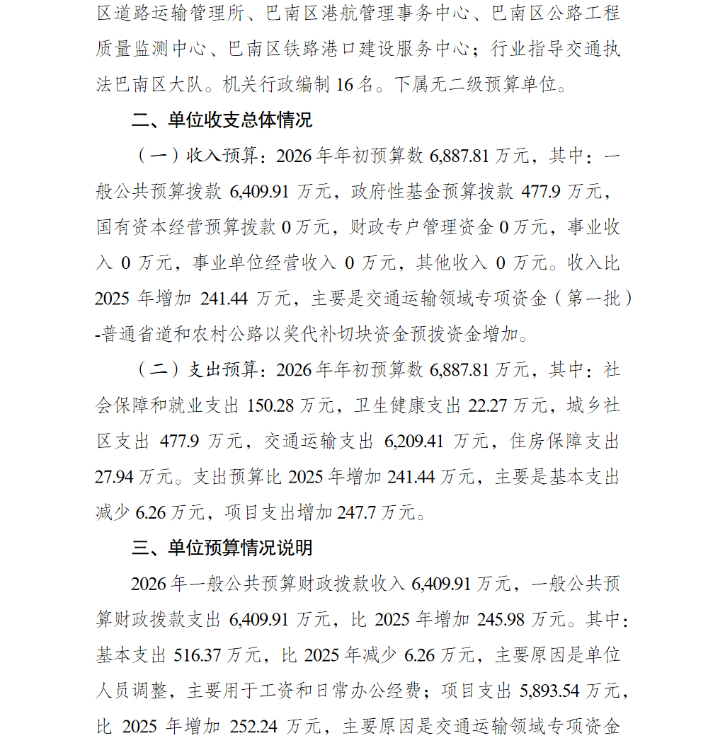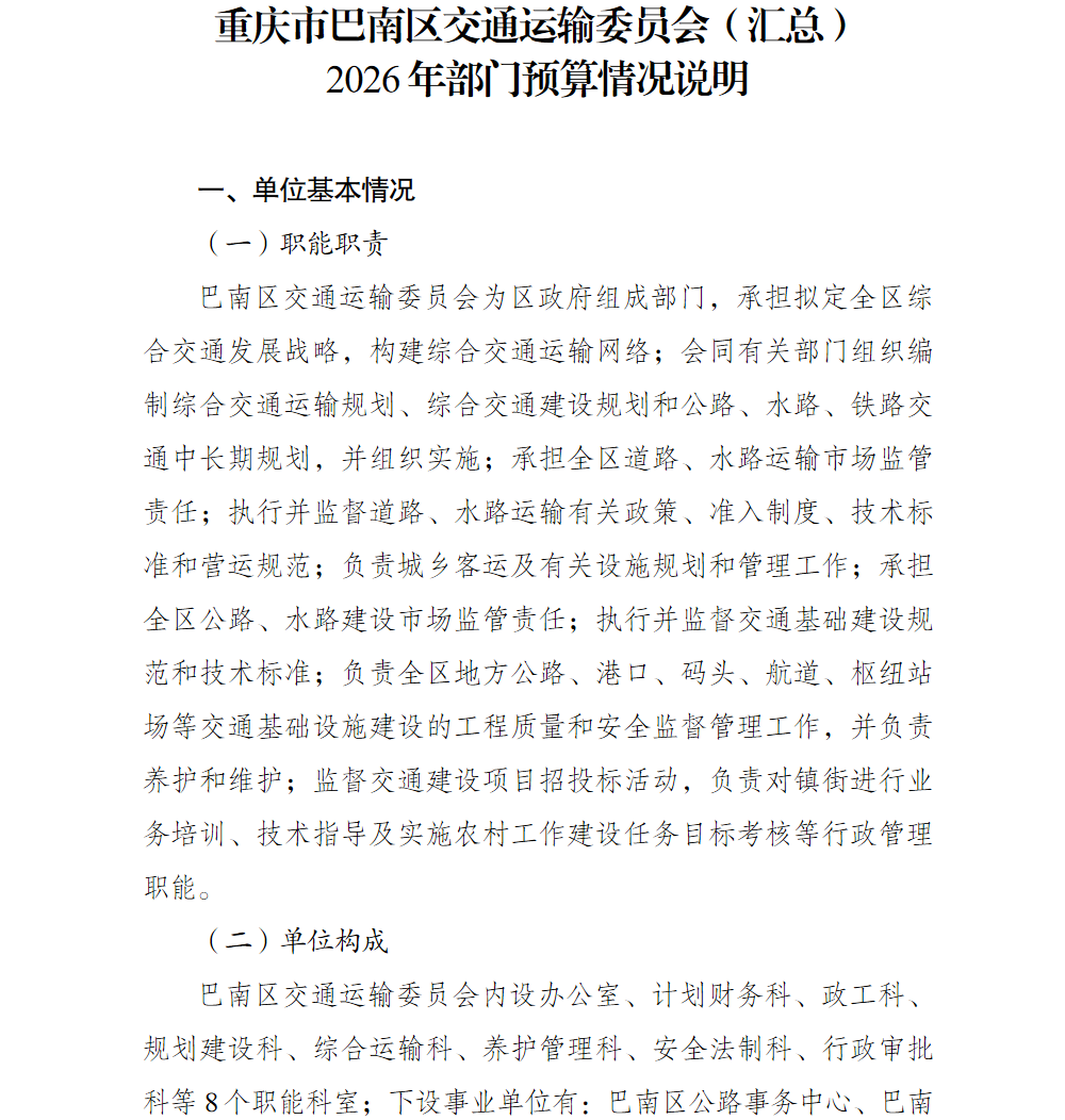 重庆市巴南区交通运输委员会2026年部门预算情况说明(汇总级和本级)