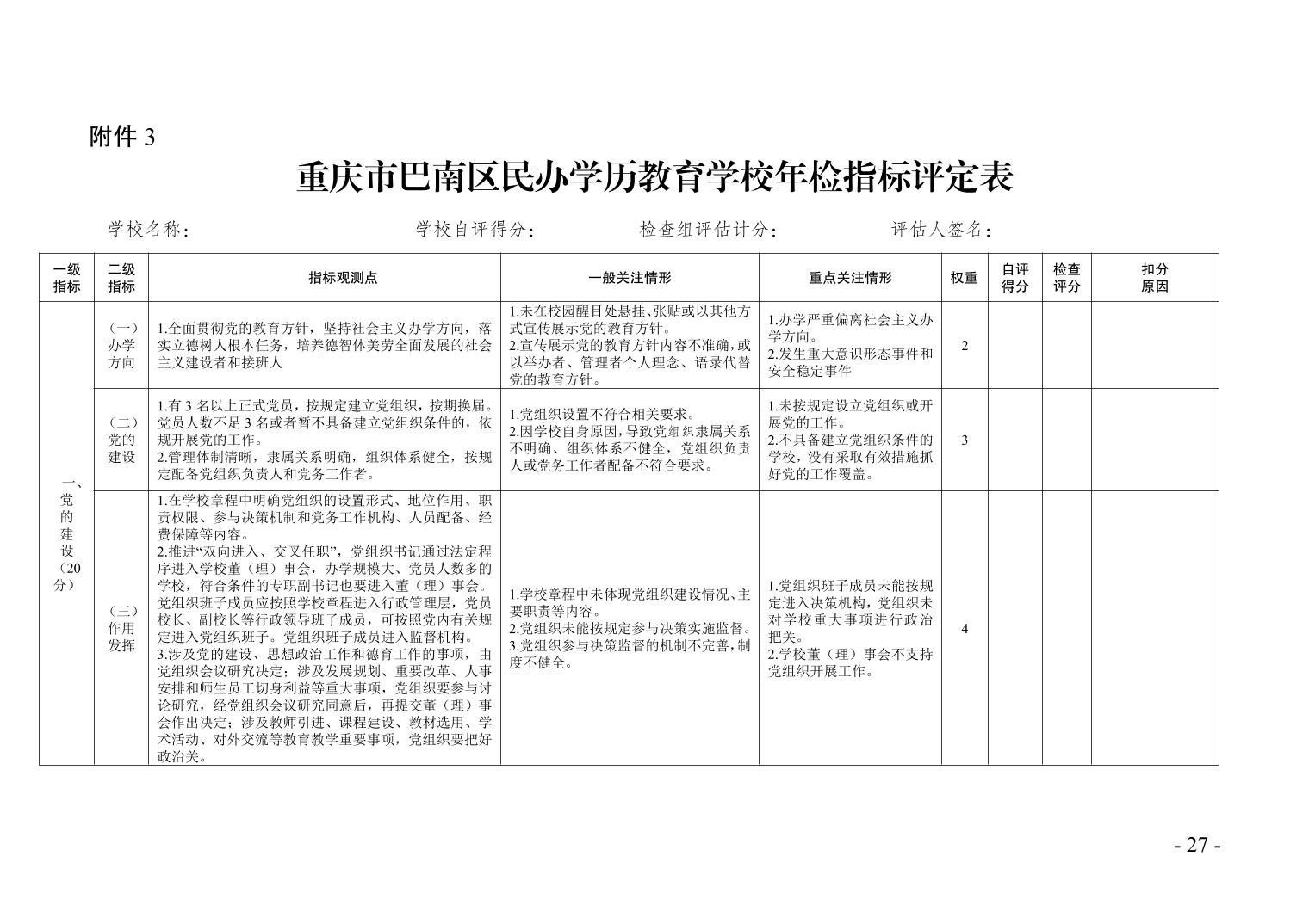 3.重庆市巴南区民办学历教育学校年检指标评定表