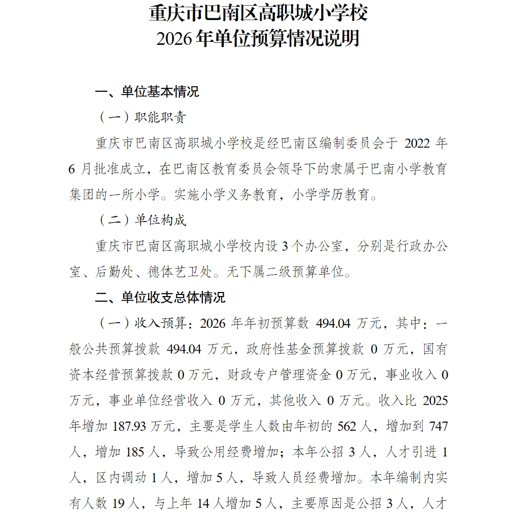 重庆市巴南区高职城小学校2026年单位预算情况说明