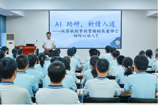 交流培训会上,市实验中学郑海涛老师带来AI融合课例展示。他引导学生借助AI工具,从分析古典诗词中的情感与句式结构,到量化感知作者情感张力,递进式提升学生文学鉴赏与创意表达能力,展现出AI在语文教学中的创新应用与独特魅力。
