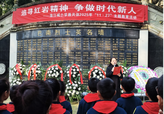 南泉革命烈士陵园内,珠江城小学、星澜汇小学、融汇二小等学校的党团队员代表,通过敬献花圈、重温誓词、微党课、红色宣讲等活动,追思先烈、厚植情怀,让“行走的思政课”落地见效。巴南小学、松花江小学、清华小学等学校通过主题升旗仪式,号召全体师生铭记历史、珍惜当下。鱼洞二小各校区联动开展系列活动,以主题升旗仪式开篇,随后分赴工农坡烈士墓、江东顺等烈士之墓祭扫,同步为一年级学生举行入队仪式,将红色教育融入多样实践,让师生接受深刻精神洗礼。