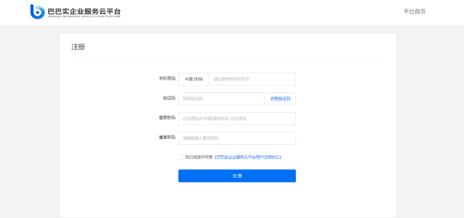 (一)在浏览器中打开巴巴实企业服务云平台:https://www.babashi.cn/
