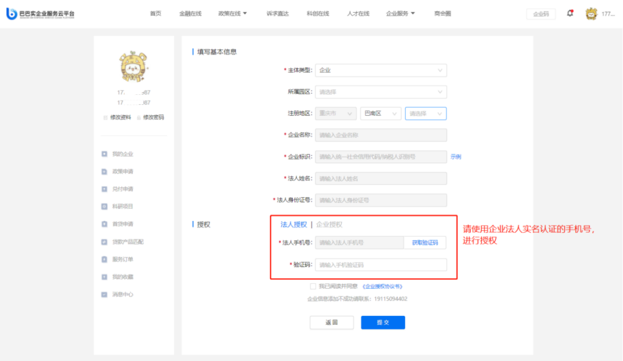 (三)完成添加企业 法人授权请使用法人实名认证的手机号进行认证授权。