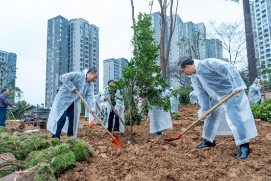 活动现场,大家冒雨分工协作,挥锹铲土、扶苗培土、提水浇灌,齐心协力栽种了七星茶花、川玛瑙、宽彩带、五色赤丹等茶花、茶梅优质苗木,为城市春日增添盎然新绿。
