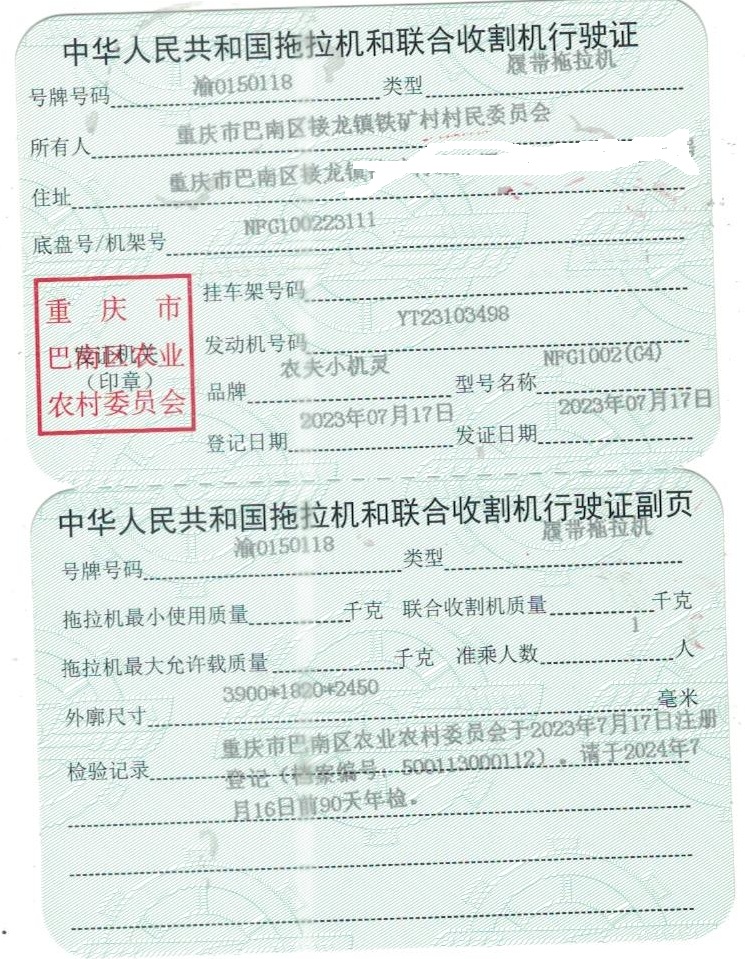 拖拉机和联合收割机行驶证渝0150118