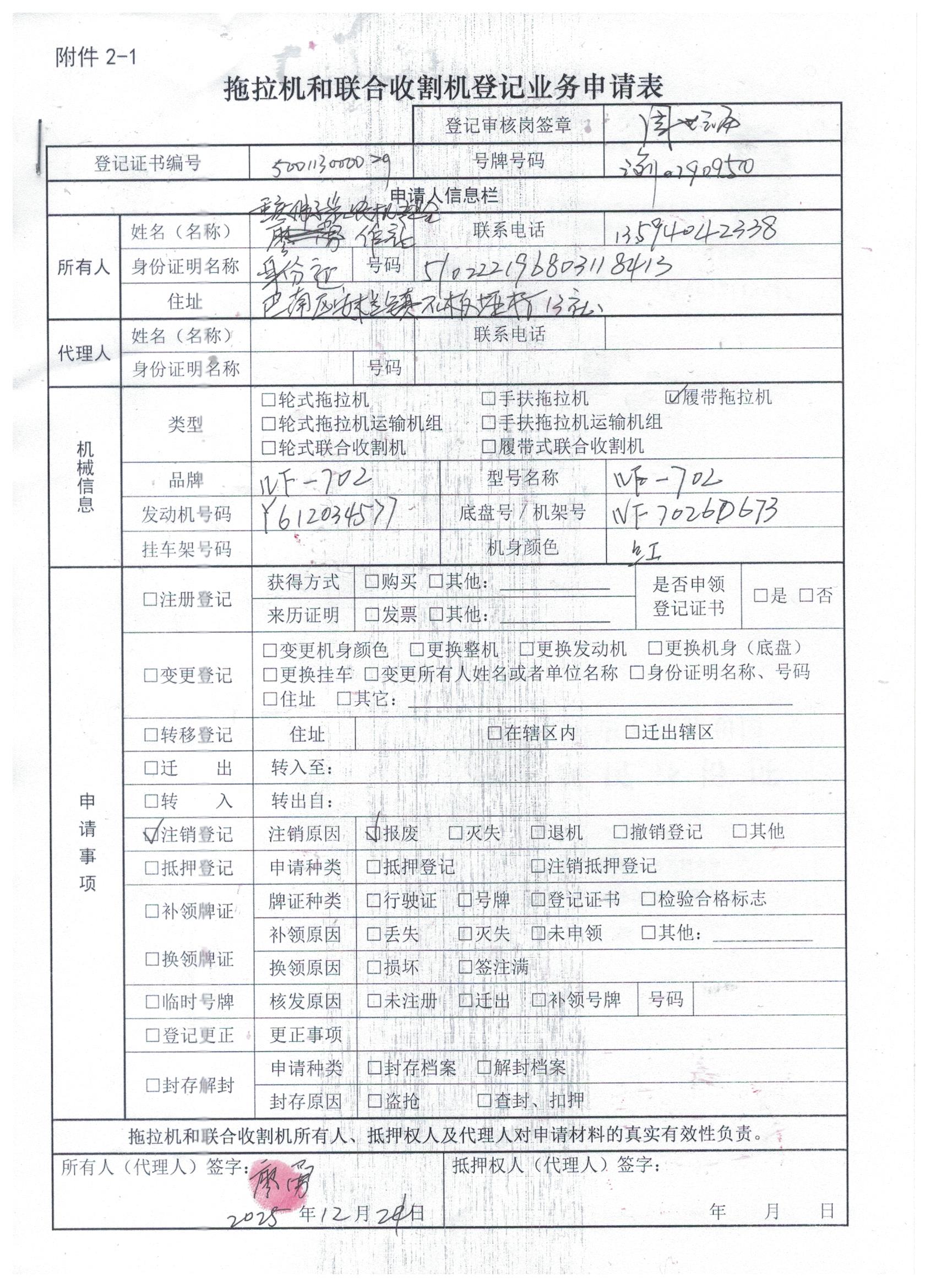 拖拉机和联合收割机行驶证(渝0190950)注销