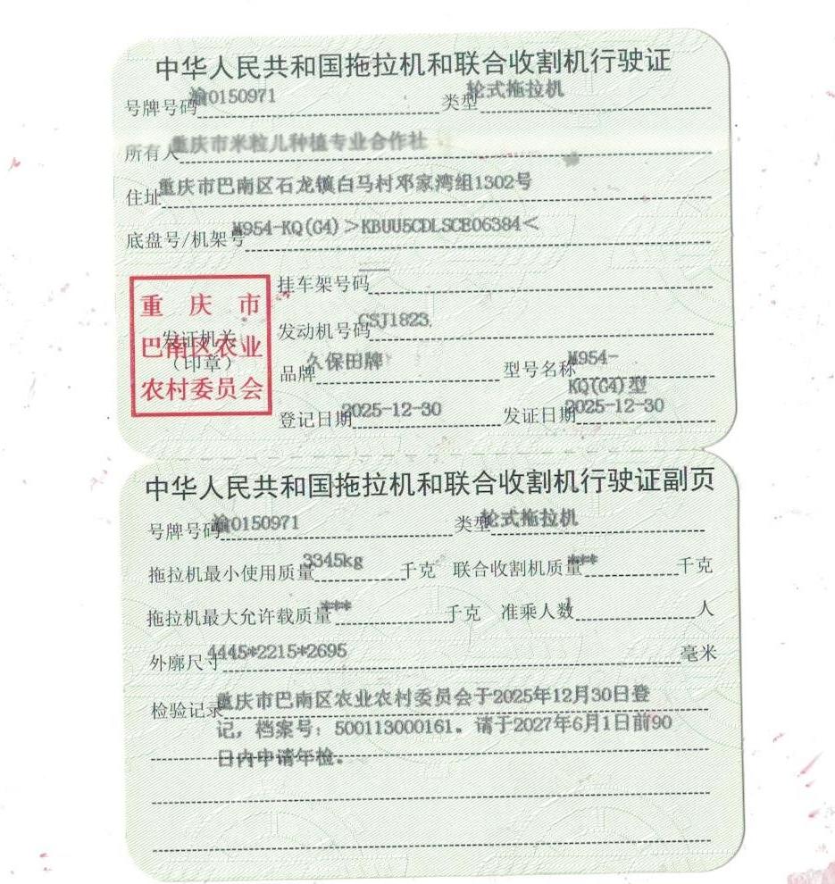 拖拉机和联合收割机行驶证(渝0150971)