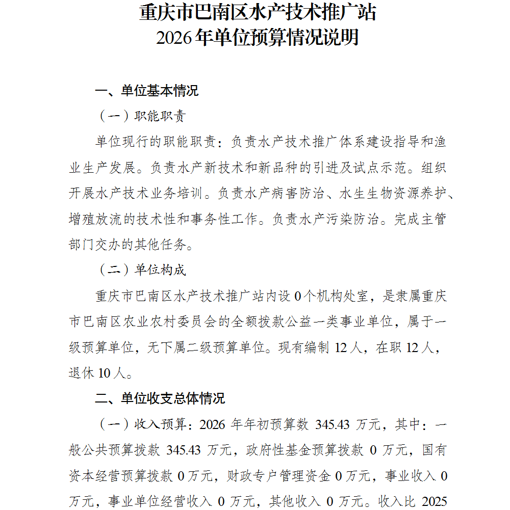 重庆市巴南区水产技术推广站2026年单位预算情况说明