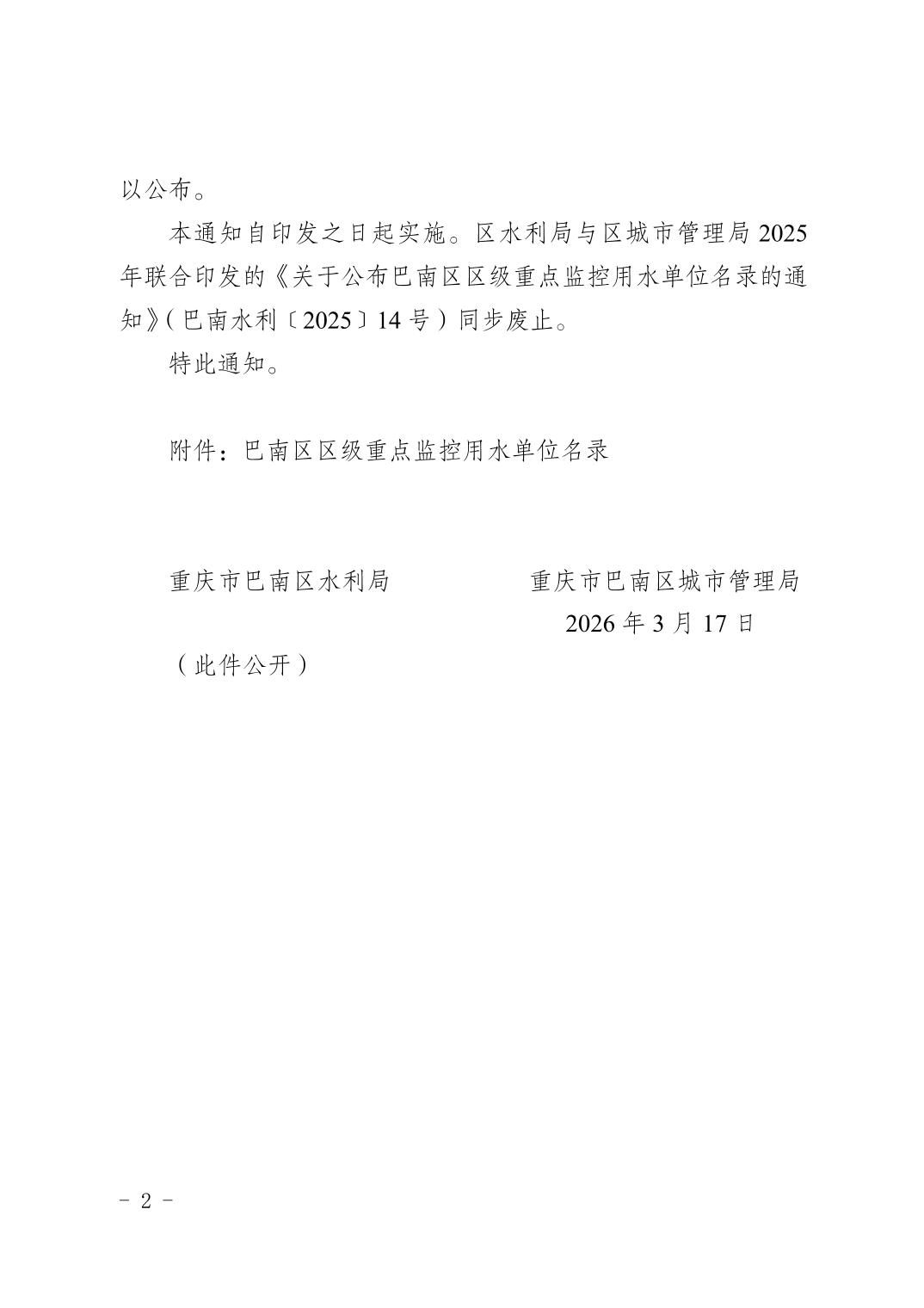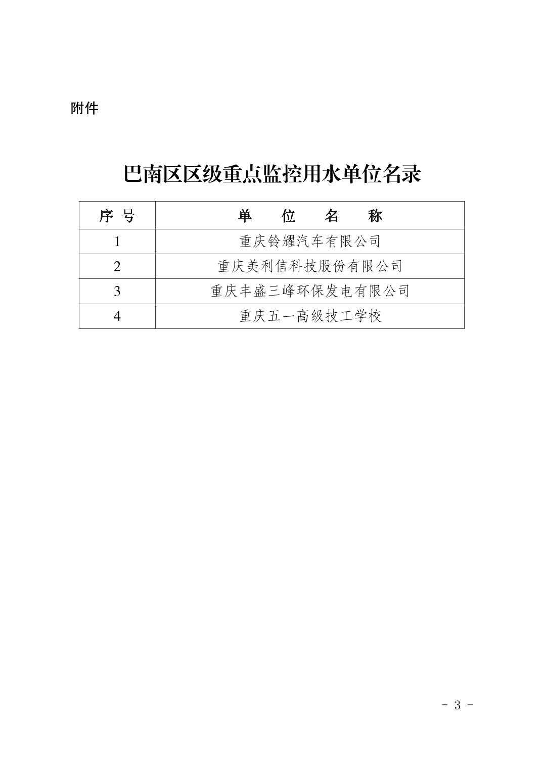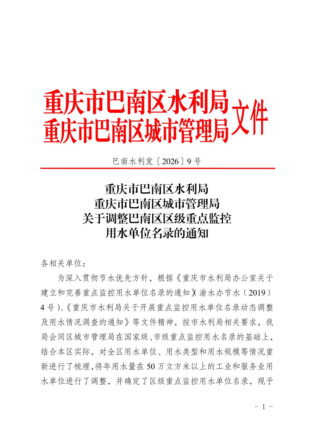 重庆市巴南区水利局关于调整巴南区区级重点监控用水单位名录的通知