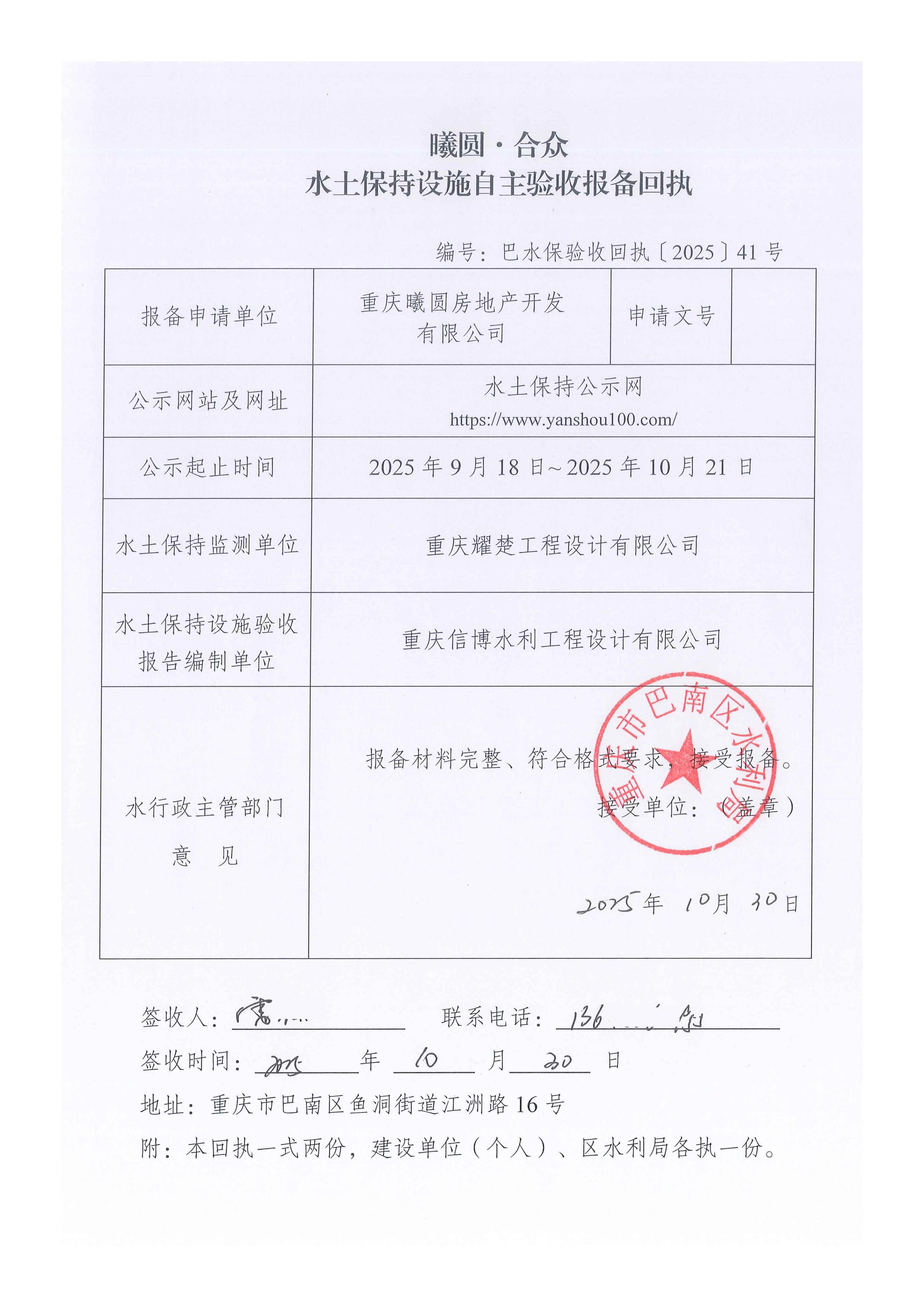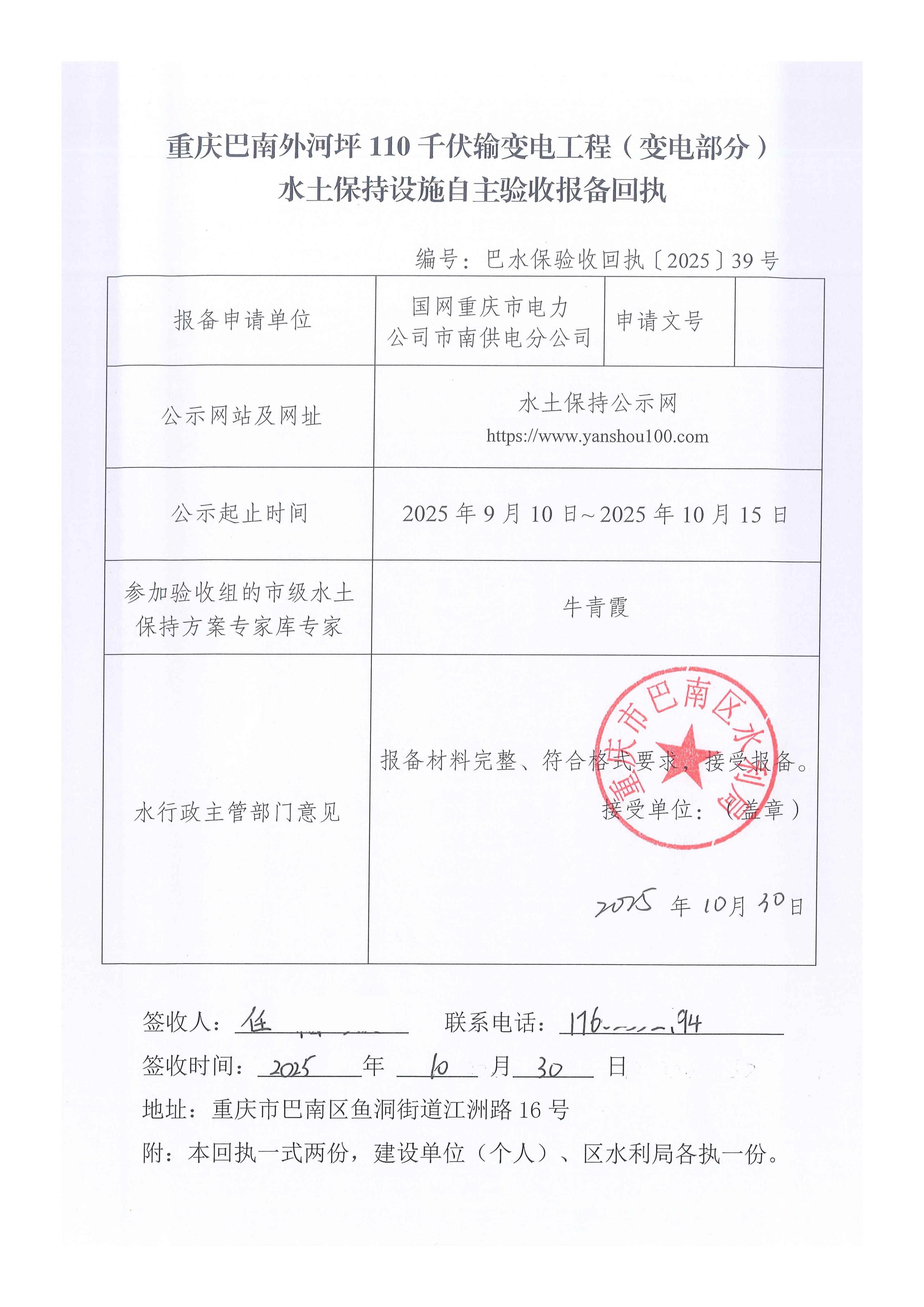 生产建设项目水土保持设施自主验收报备回执公示(38-41号)