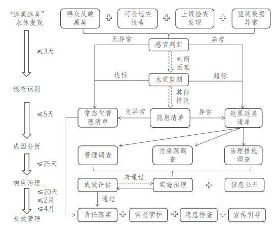4.响应时限。对核查确认返黑返臭水体启动处置机制。由区生态环境局联合相关单位分析污染成因,5个工作日内确定处置办法。