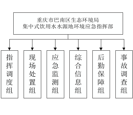 由重庆市巴南区生态环境局统筹成立集中式饮用水水源地突发环境事件应急指挥部(以下简称局指挥部),指挥部实行指挥长负责制,当发生突发环境事件时,由区生态环境局主要负责人任指挥长,分管负责人任副指挥长。局指挥部根据需要下设指挥调度组、现场处置组、应急监测组、综合信息组、后勤保障组、事故调查组六个应急小组,开展应急处置工作。各工作组的成员单位见附则8.2。