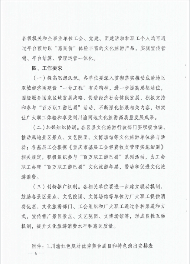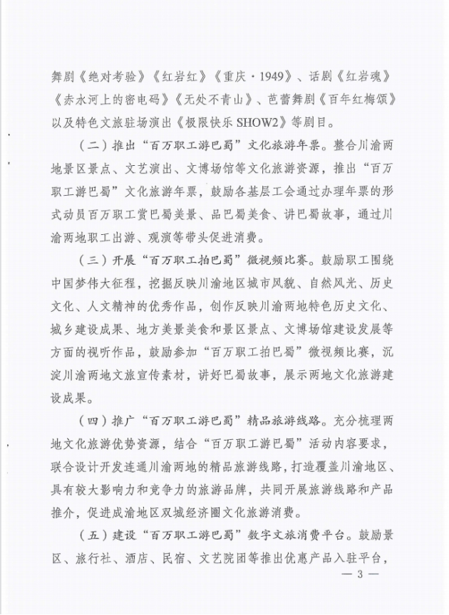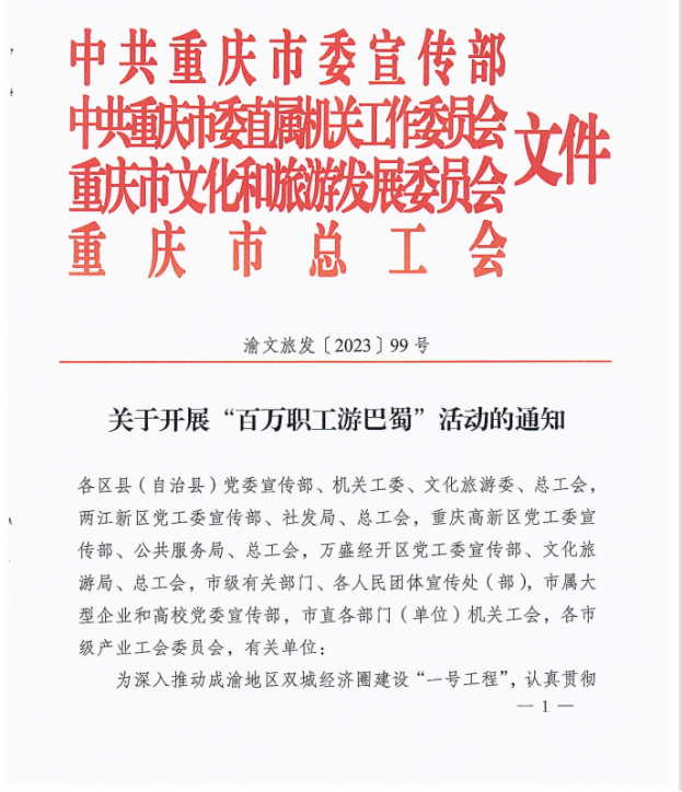 为深入推动成渝地区双城经济圈建设“一号工程”,促进全市文化旅游高质量发展,市委宣传部、市直机关工委、市文化旅游委、市总工会近日下发了《关于开展“百万职工游巴蜀”活动的通知》(渝文旅发〔2023〕99号),请各工会按照《重庆市基层工会经费收支管理实施细则》相关规定,积极支持和参与“百万职工游巴蜀”活动,切实让广大职工体验和享受川渝两地文旅高质量发展成果,带动和促进文化旅游消费。