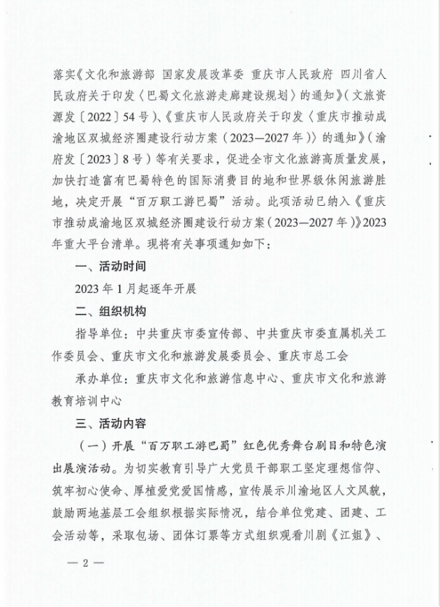 附件:渝文旅发〔2023〕99号关于开展“百万职工游巴蜀”活动的通知