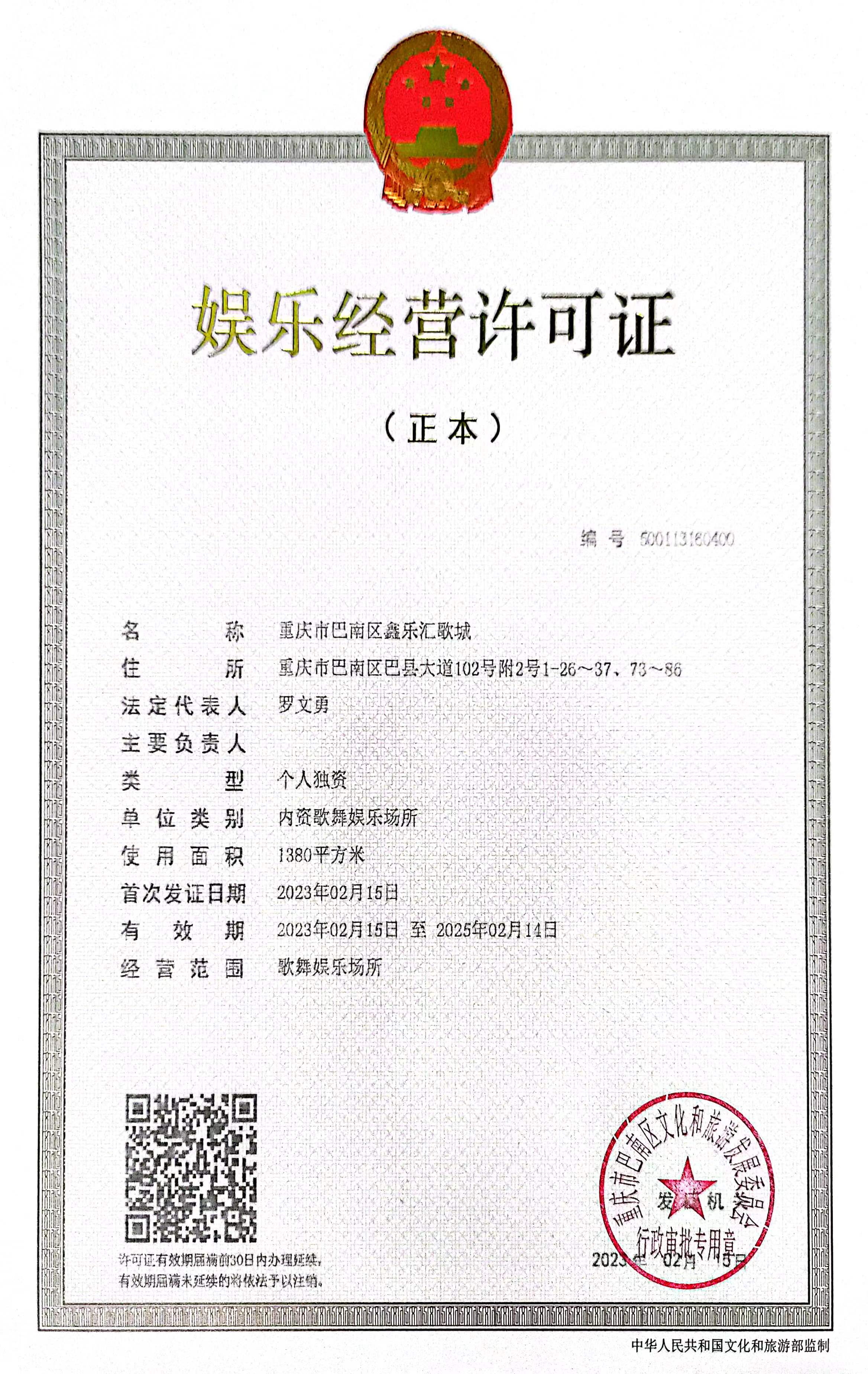 重庆市巴南区鑫乐汇歌城娱乐经营许可证公布