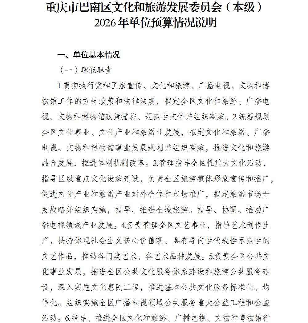 重庆市巴南区文化和旅游发展委员会2026年部门预算情况说明(本级))