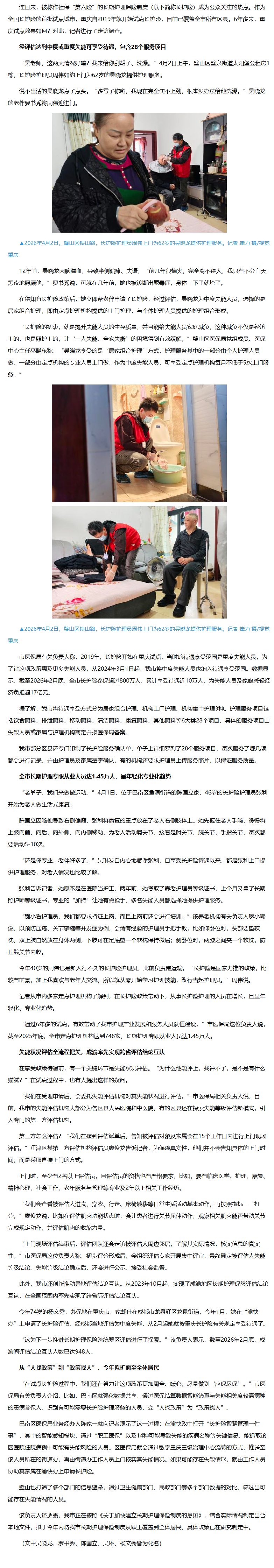 重庆试点长护险六年:近10万人享受待遇,累计为失能人员及家庭减负超17亿元