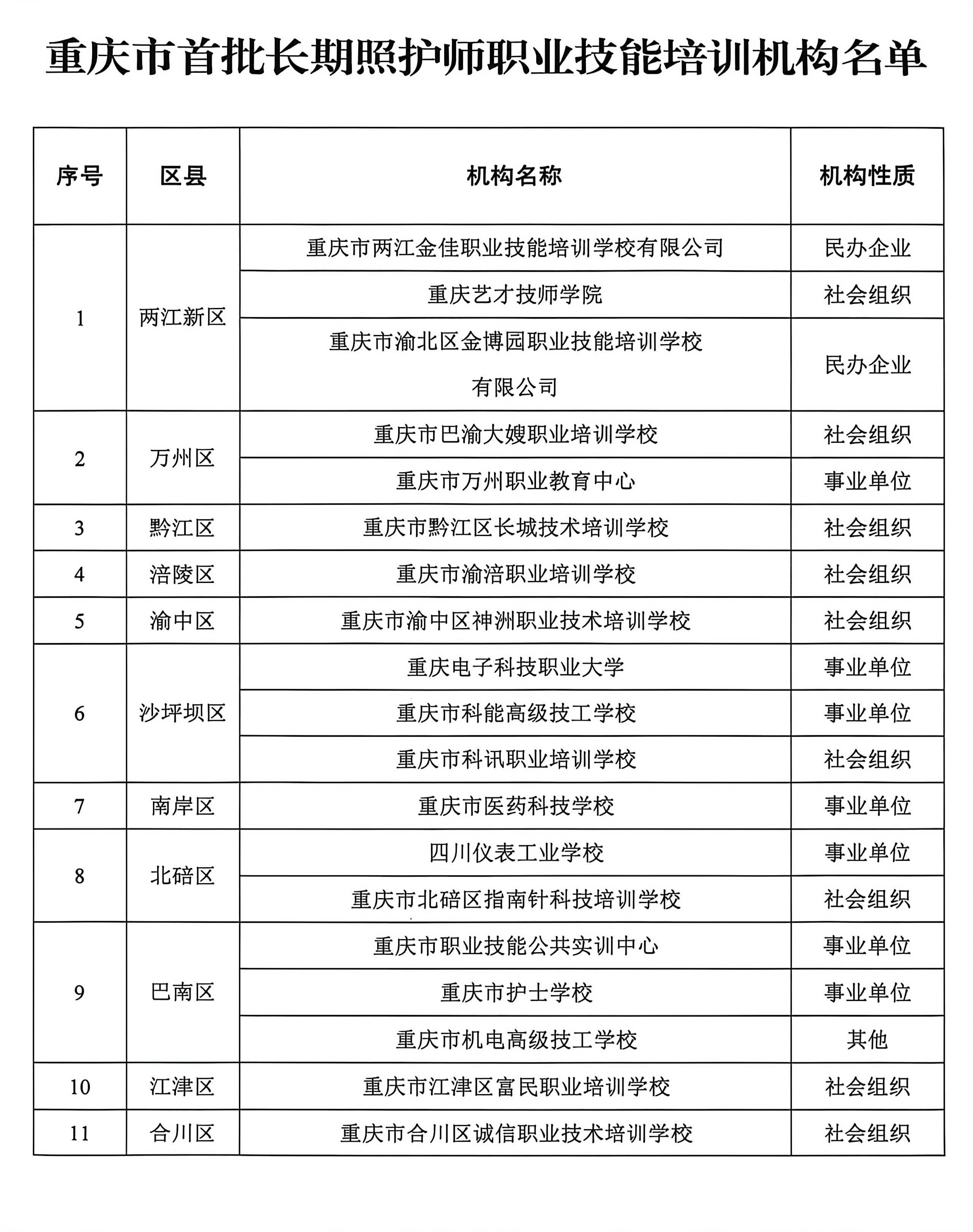 为贯彻落实国家医保局、人力资源社会保障部等7 部门《关于做好当前长期照护师培养培训工作的通知》(医保发〔2025〕11 号)等文件精神,推动长期照护专业化、职业化、规范化发展,助力提高长期护理服务质量,更好保障长期护理保险享受待遇群众的权益,2025年12月31日,重庆市医疗保障局办公室重庆市人力资源和社会保障局办公室下发了《关于确定首批长期照护师职业技能培训机构的通知》(渝医保办〔2025〕92号),确定了36 家单位为我市首批长期照护师职业技能培训机构,现将名单公布。