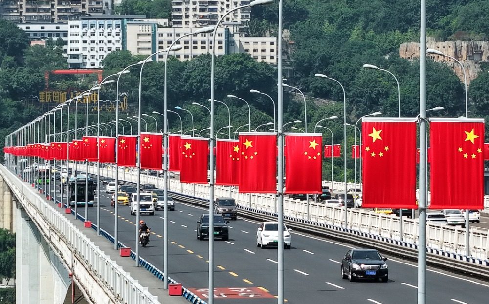 重庆:迎国庆 长江大桥飘扬“中国红”