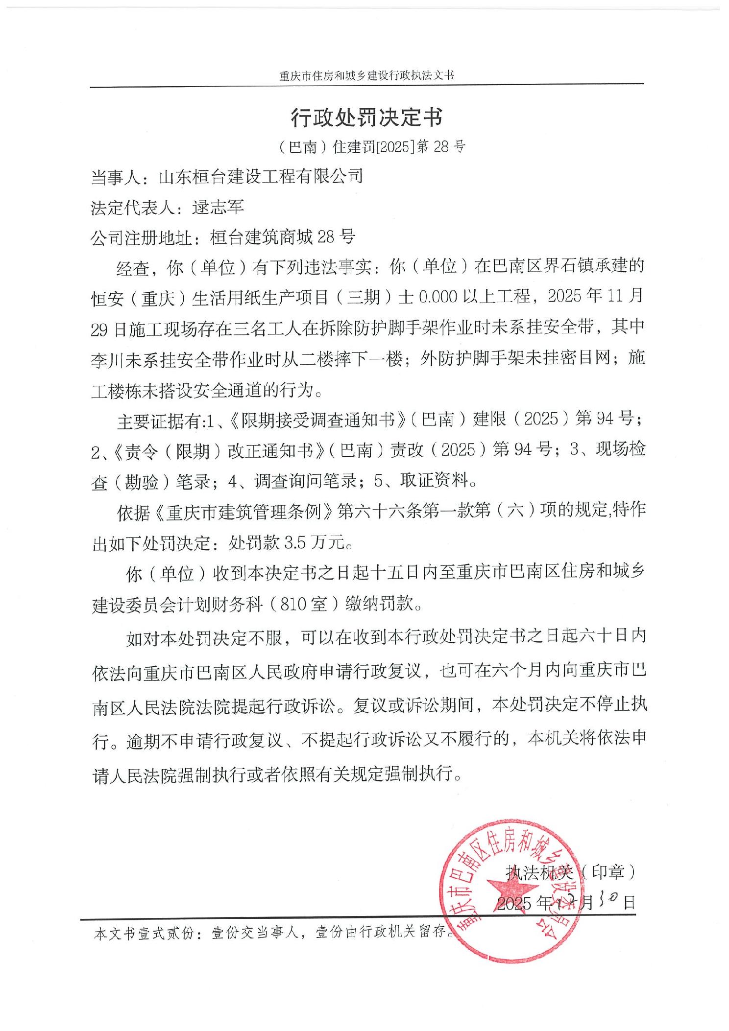 行政处罚决定书(巴南)住建罚【2025】第28号