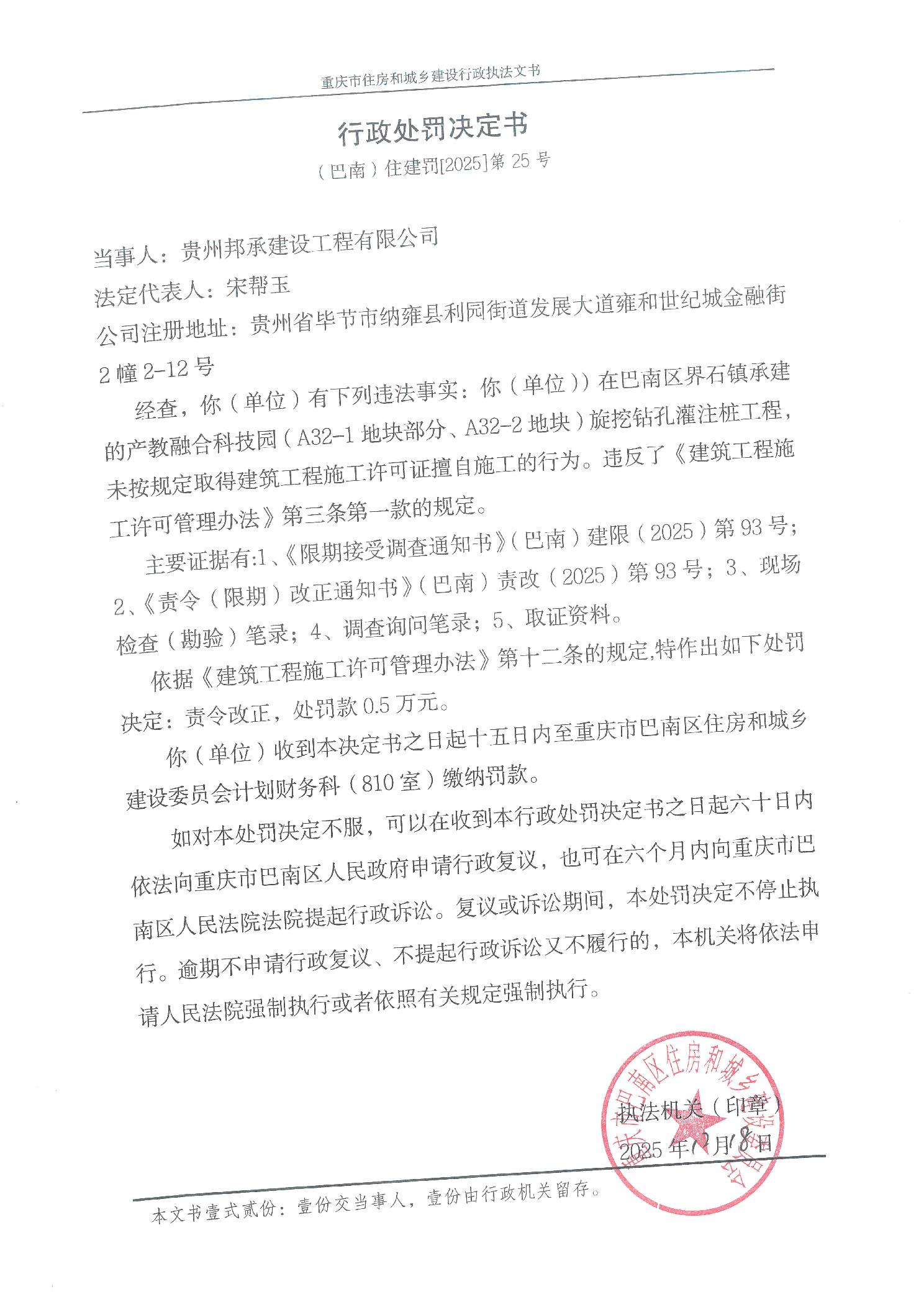 行政处罚决定书(巴南)住建罚【2025】第25号