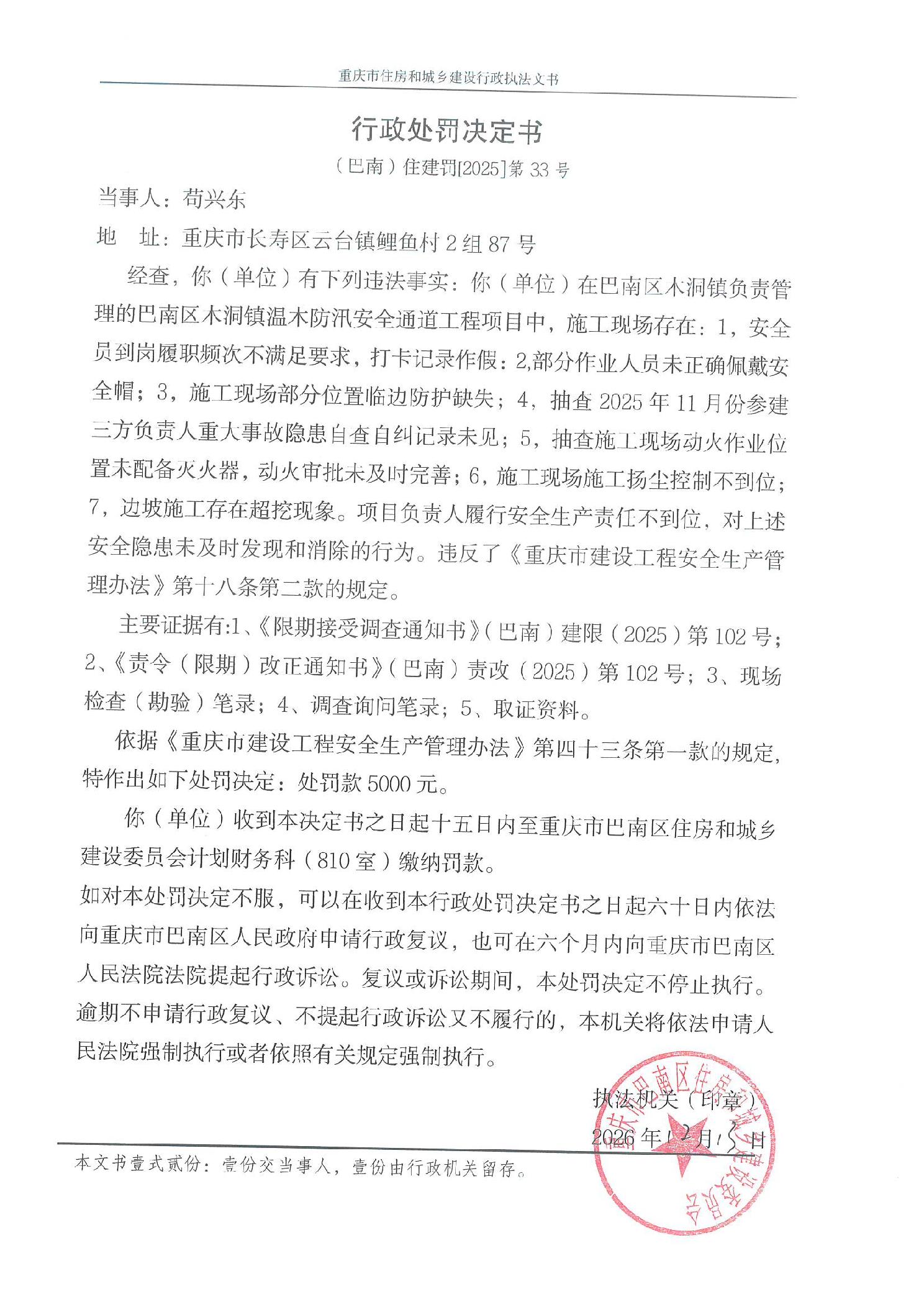 行政处罚决定书(巴南)住建罚【2025】第33号