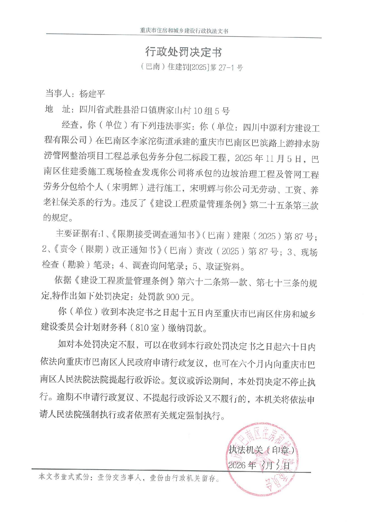 行政处罚决定书(巴南)住建罚【2025】第27号