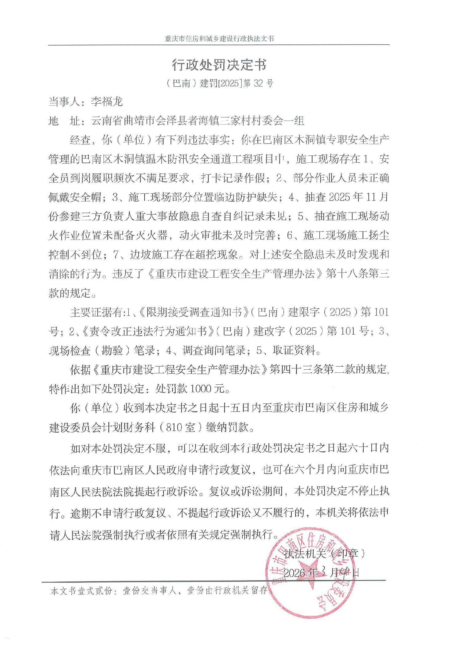 行政处罚决定书(巴南)住建罚【2025】第32号