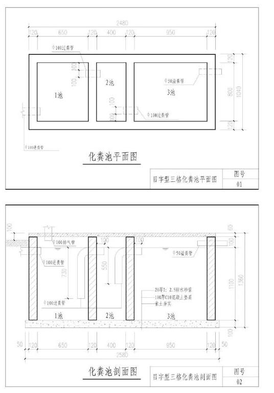 1.化粪池要高出地面十公分,盖板要密闭,一二三池都要留清掏孔,一二池达四十公分,三池达三十公分,清掏孔要有盖板,一二池要用二灰密闭,三池不能密闭。一二三池比例2:1:3,(内部净长65:40:95)内壁净长2m,净深1m,净宽0.8m,外部长宽高分别为2.48米、1.04米、1.2米,除了溢粪管用50管,其他的管子全部用100管(包括出气孔),排气孔不靠墙要有两米高,靠墙高出屋檐50公分,顶端用三通!使用人数在三人及以下的,有效容积不得小于1.5 m3。