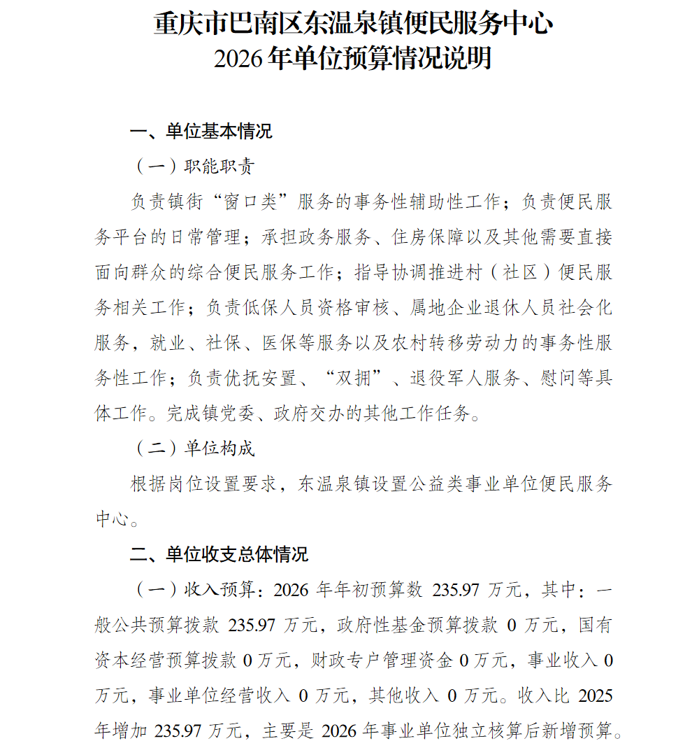 重庆市巴南区东温泉镇便民服务中心2026年单位预算情况说明