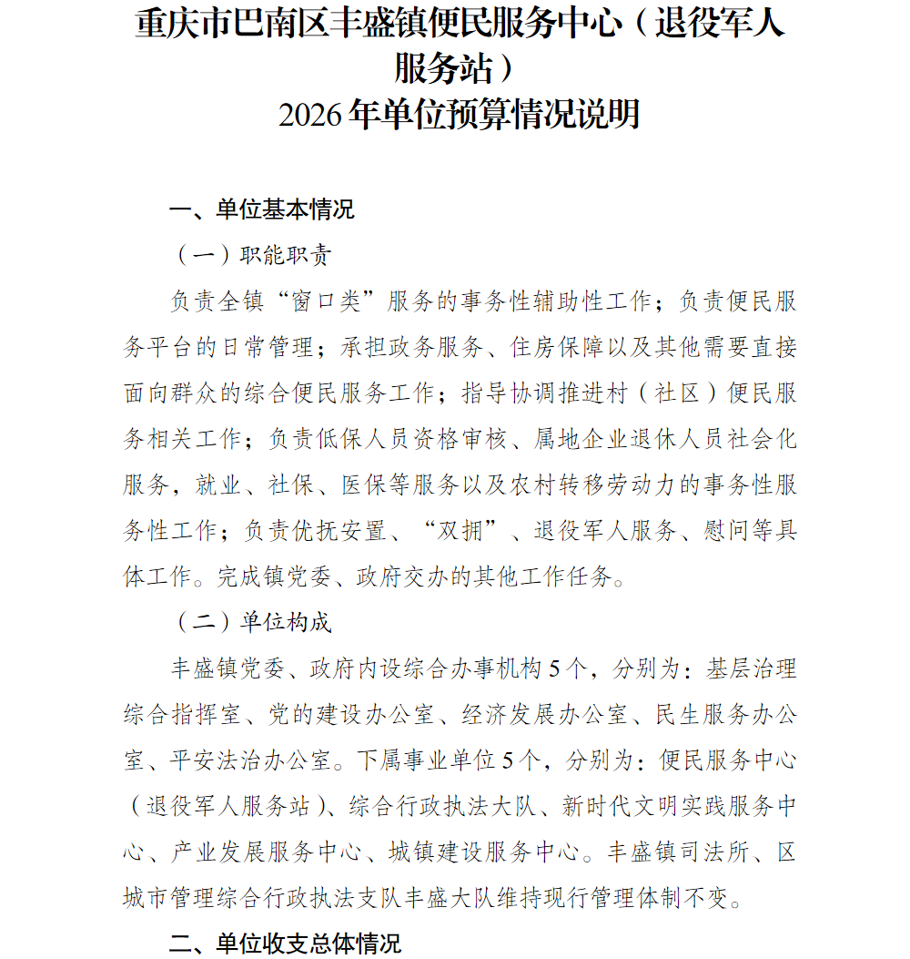 重庆市巴南区丰盛镇便民服务中心(退役军人服务站)2026年单位预算公开