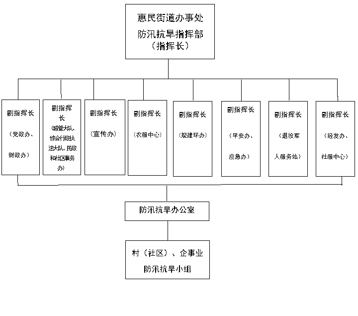 (1)成立惠民街道防汛抗旱指挥部,在街道党工委、办事处统一领导下,负责组织和指挥全街道防汛抗旱工作。各村(居)和企事业单位设立相应的防汛抗旱机构,在街道防汛抗旱指挥部指导下,组织和指挥本辖区的防汛抗旱工作,其框架结构图如下: