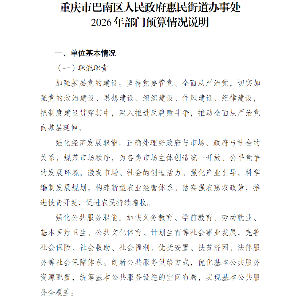 重庆市巴南区人民政府惠民街道办事处2026年部门预算情况说明