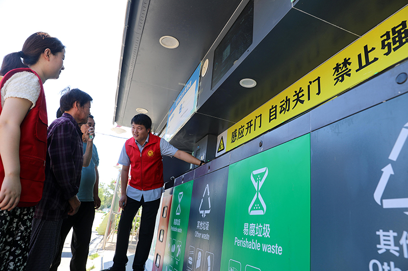 在安徽省合肥市长丰县庄墓镇枣林社区,志愿者指导居民使用智能垃圾分类回收设备(2023年9月1日摄)。新华社记者 曹力 摄