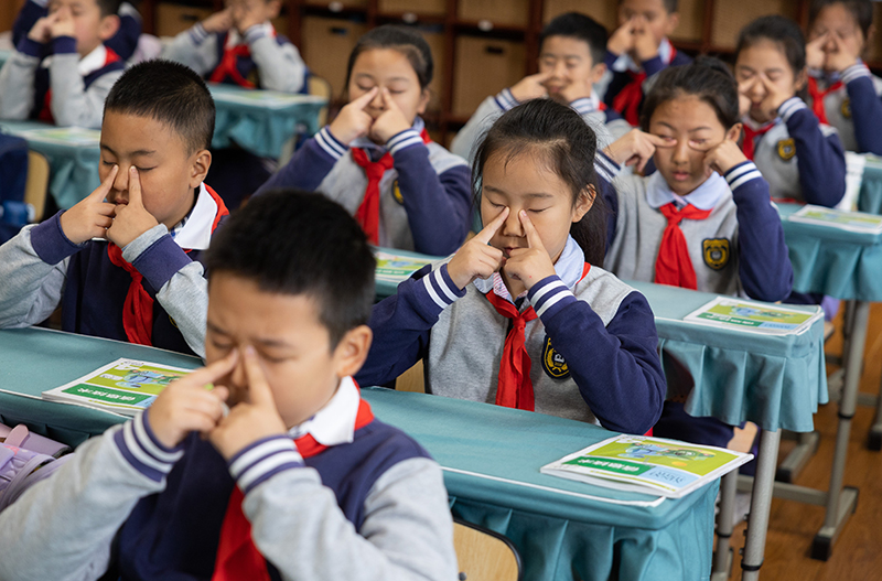 在四川省成都市迎宾路小学,四年级一班的同学们在课间做眼保健操(2023年11月17日摄)。新华社记者 江宏景 摄
