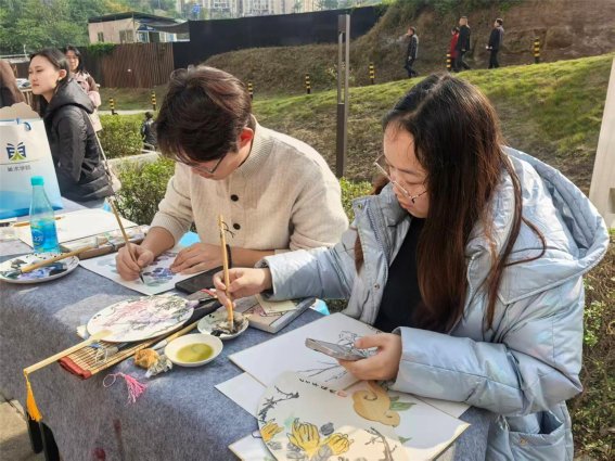 活动现场,居民们参观了精美的画展,还在美术学院师生的引导下,积极参与宫扇绘制、卡纸国画创作、书法体验等艺术活动。一位携带孩子前来观展的居民表示:“在社区不仅能欣赏到高校的专业艺术作品,还能亲自体验创作过程,我觉得很有意义。”