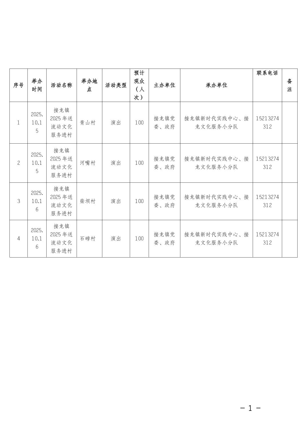 接龙镇2025年10月文化活动预安排表