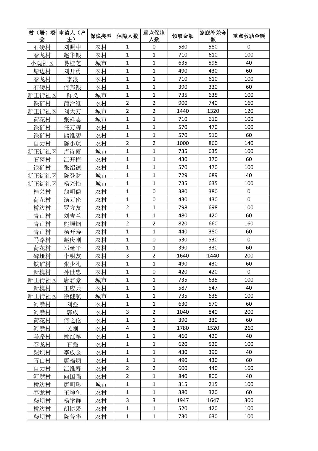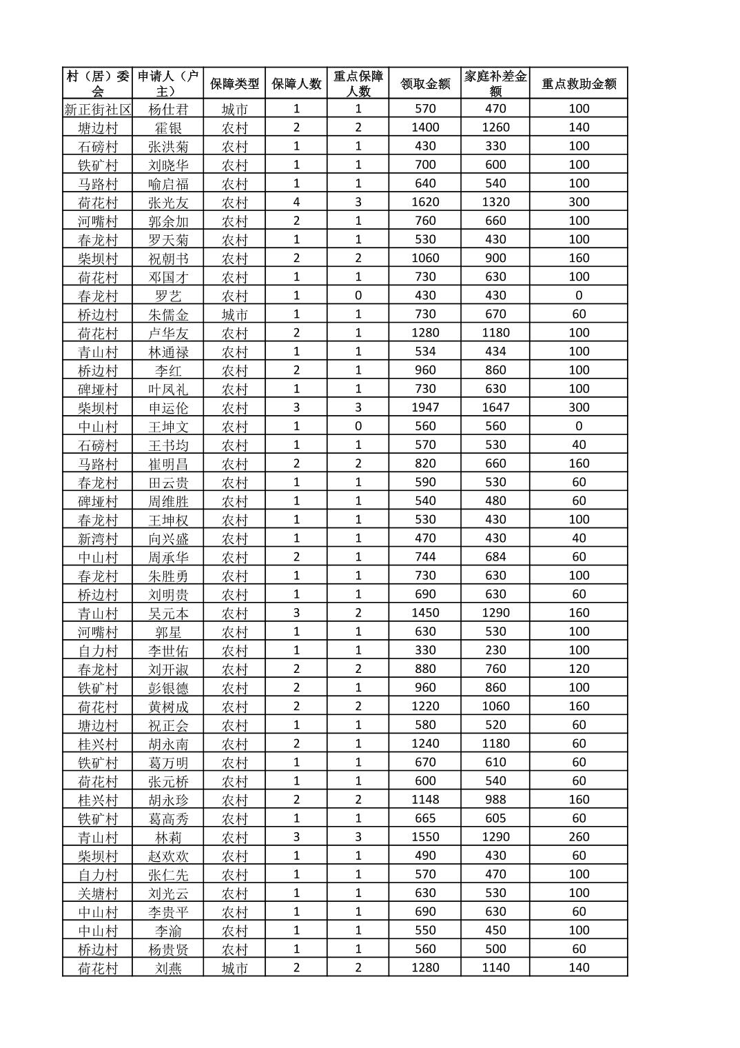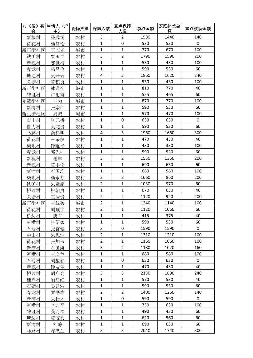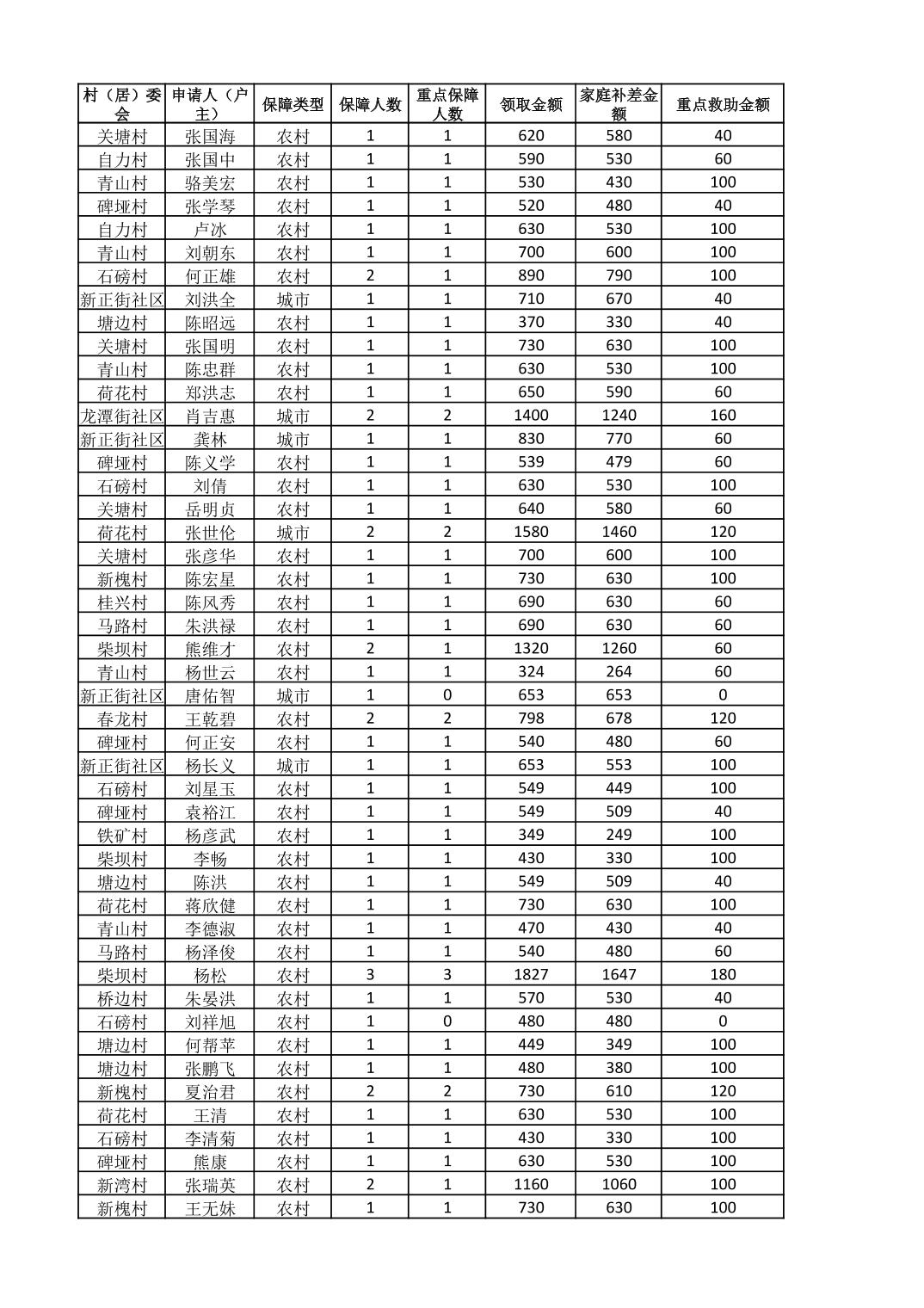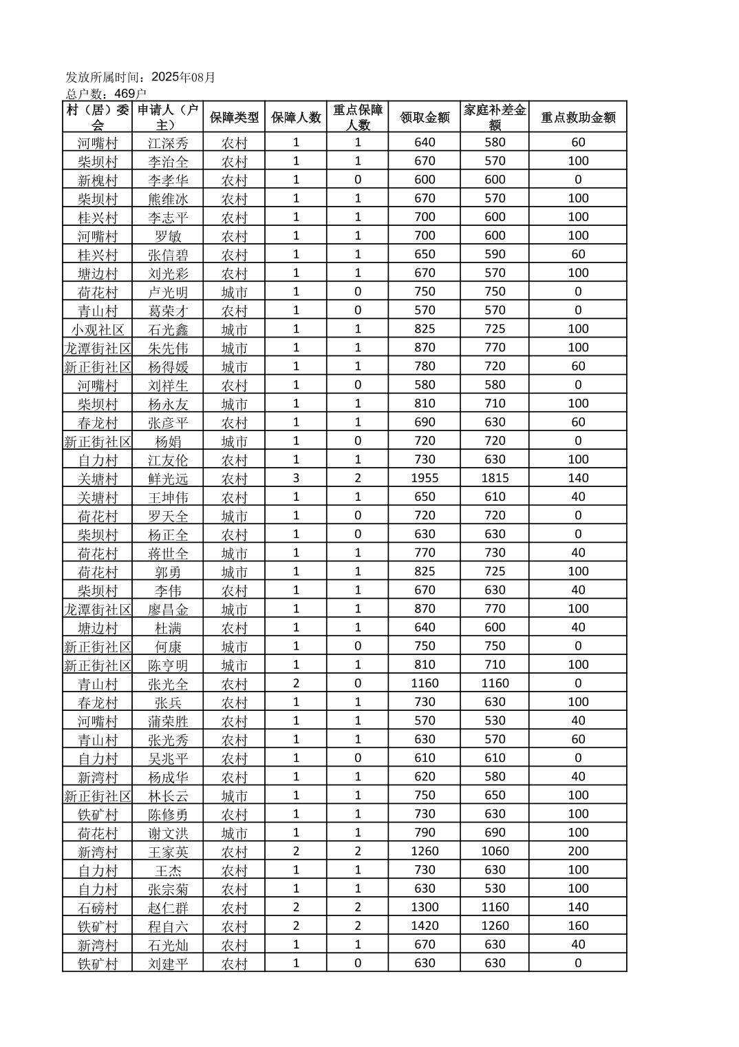 接龙镇2025年8月最低生活保障金发放表