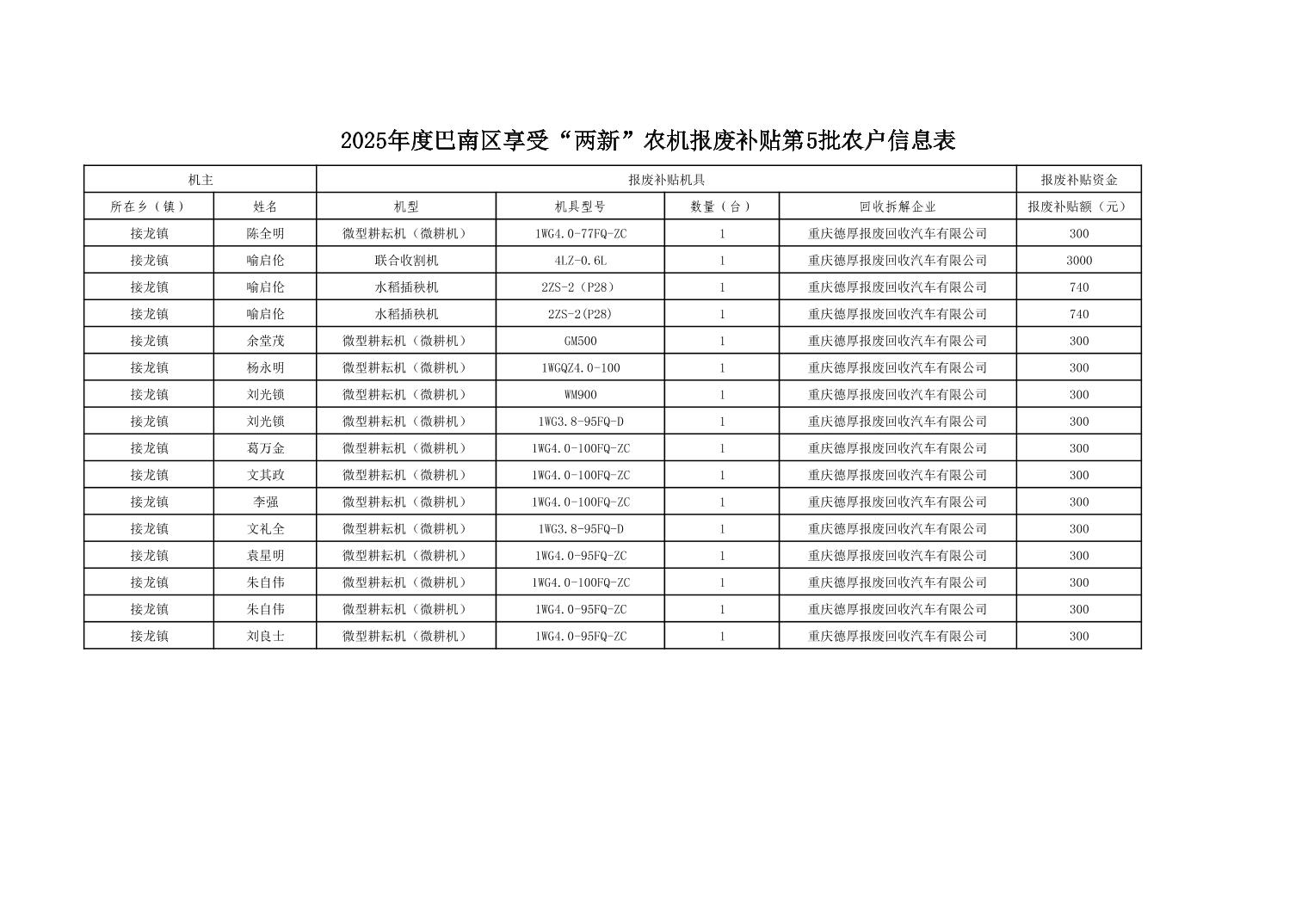 2025年5批“两新”农机报废补贴农户信息表