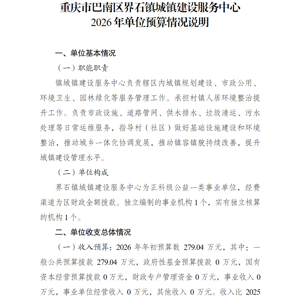 重庆市巴南区界石镇城镇建设服务中心2026年单位预算情况说明