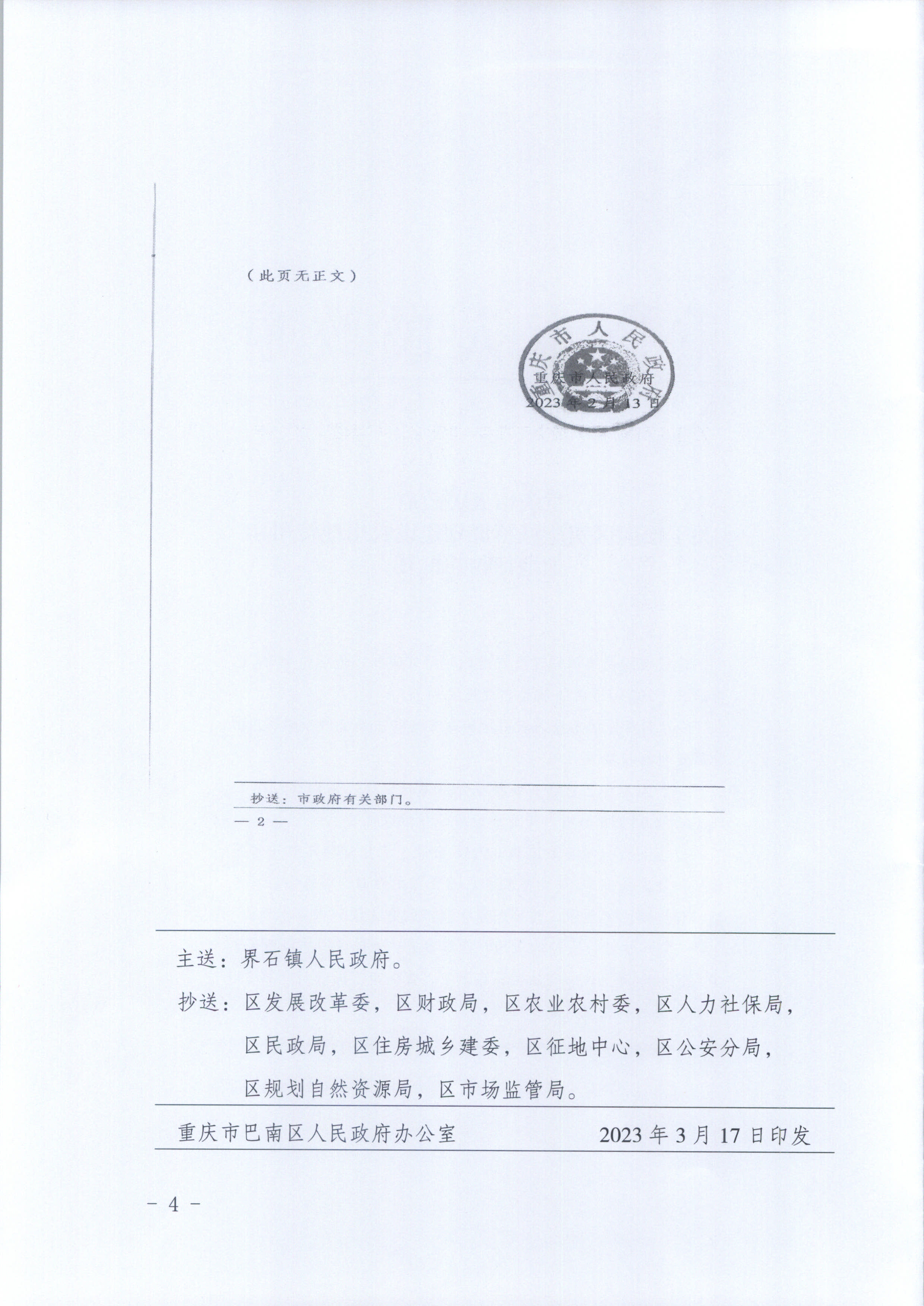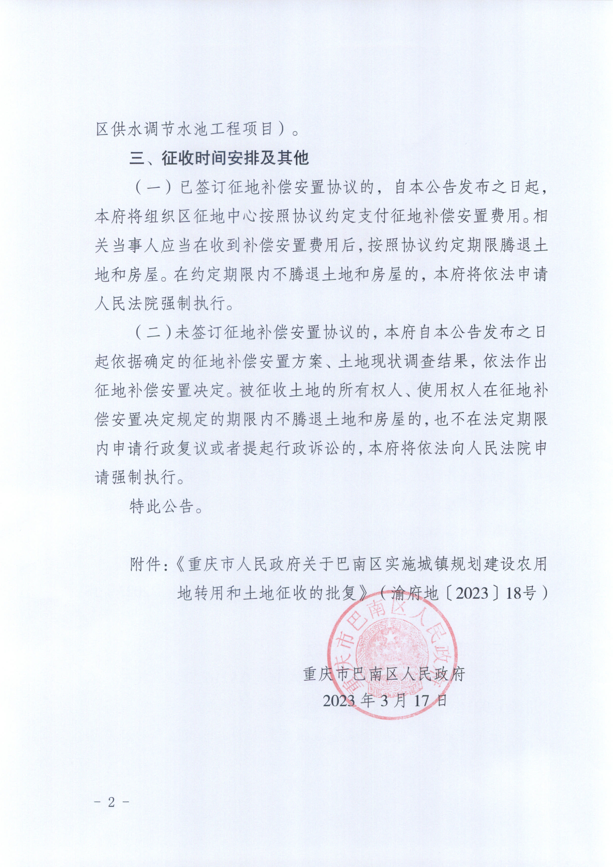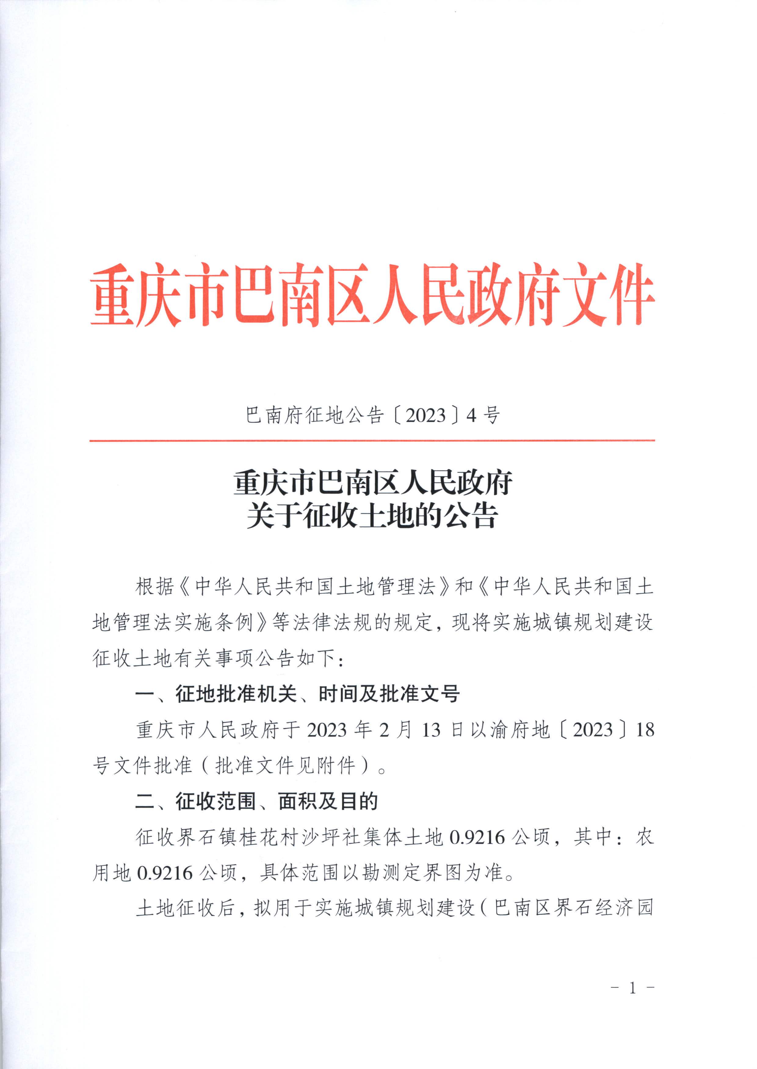 | [ 索引号 ] | 115001130093088292/2023-00020 | [ 发文字号 ] | 巴南府征地公告〔2023〕4号 |