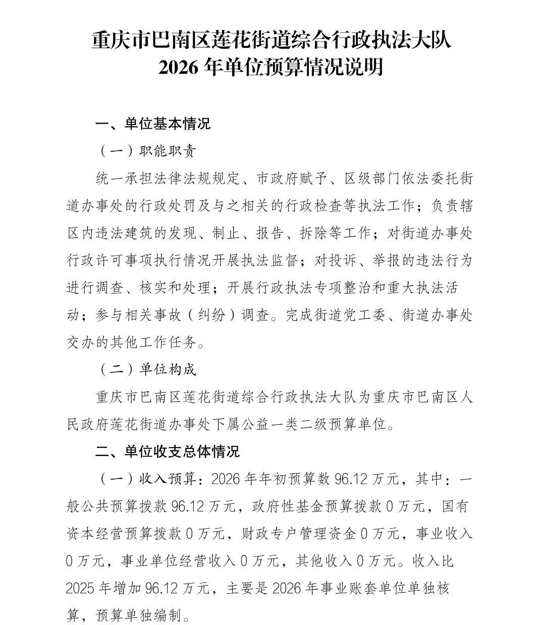 重庆市巴南区莲花街道综合行政执法大队2026年单位预算情况说明及附表
