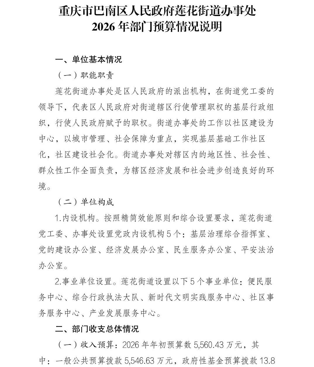 重庆市巴南区人民政府莲花街道办事处2026年部门预算情况说明及附表