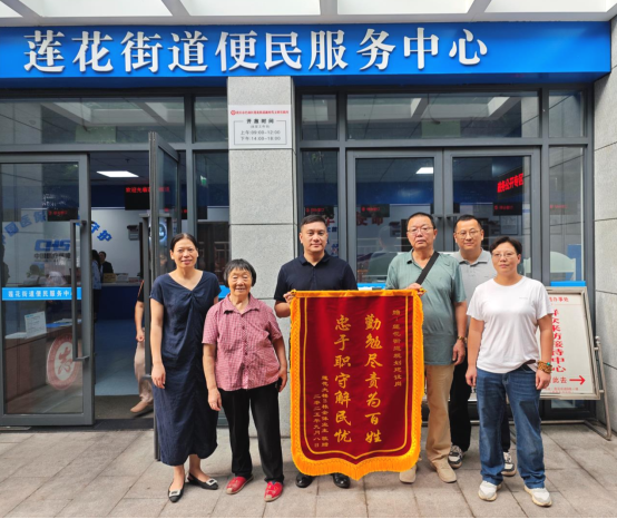 近日,莲花街道莲花社区莲花楼B栋的3位居民代表,将一面绣有“勤勉尽责为百姓 忠于职守解民忧”的锦旗送到莲花街道,为街道推动老旧楼栋改造、解决居民“心头患”的举措点赞。