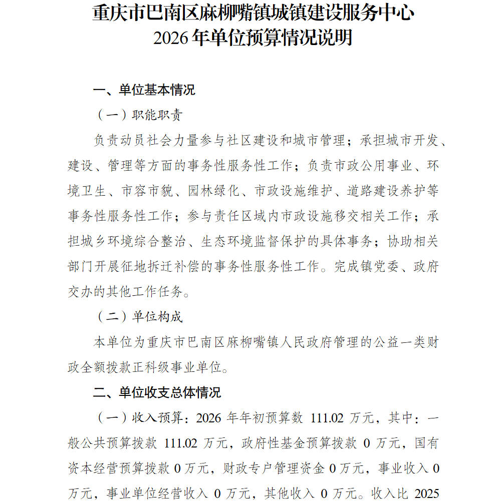 重庆市巴南区麻柳嘴镇城镇建设服务中心2026年单位预算情况说明及附表